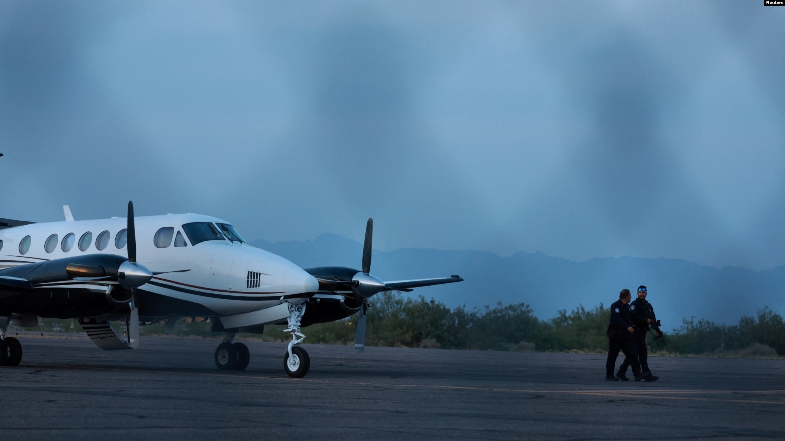 A plane believed to have carried Mexican drug lord Ismael “El Mayo” Zambada and Joaquin Guzman Lopez is seen on the tarmac of the Dona Ana County private airport, in Santa Teresa, NM, 25 July 2024.