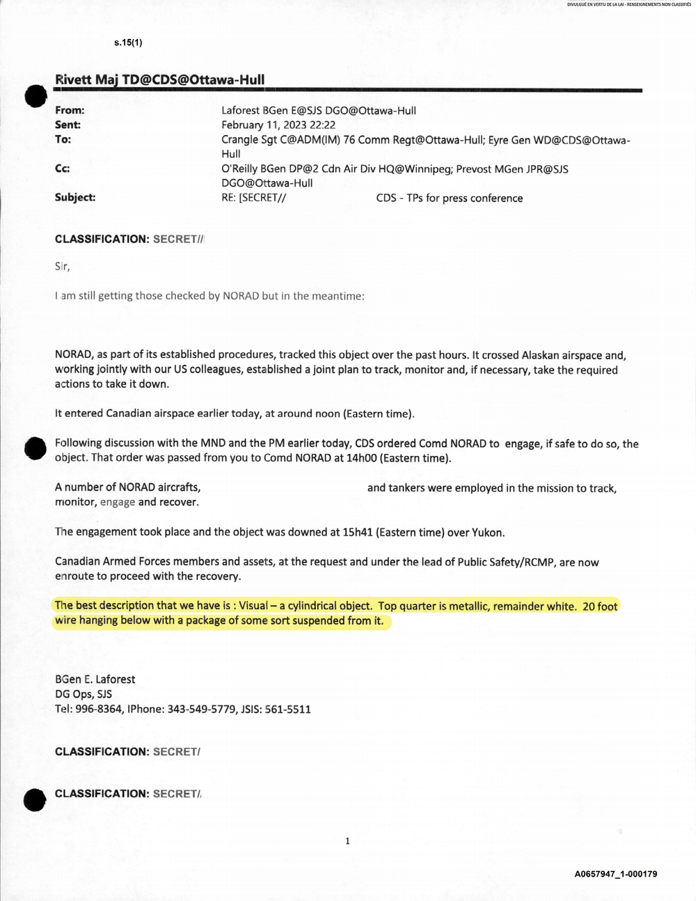Canada’s CTV News obtained a report from their nation’s Department of National Defense on the 11 Feb 2023 Yukon incident, the contents of which include a brigadier general’s description of the unknown object as “cylindrical,” with a metallic top quarter and the rest of it white. It also mentions a package attached to the object by a 20-foot wire.