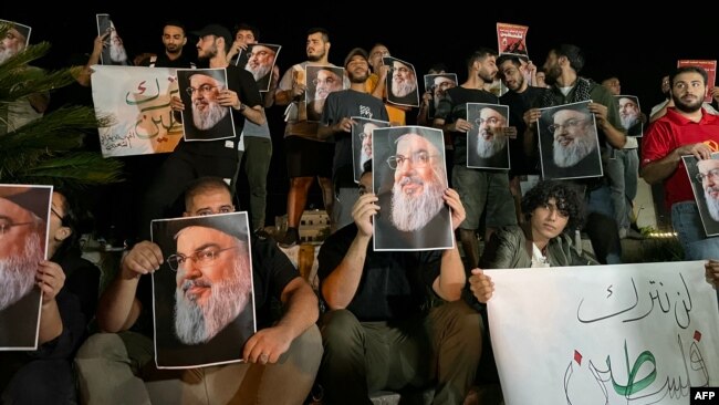 Demonstrators hold pictures of Hassan Nasrallah, late leader of the Lebanese group Hezbollah, during a protest vigil in the southern Lebanese city of Sidon on 28 Sep. Photo: AFP