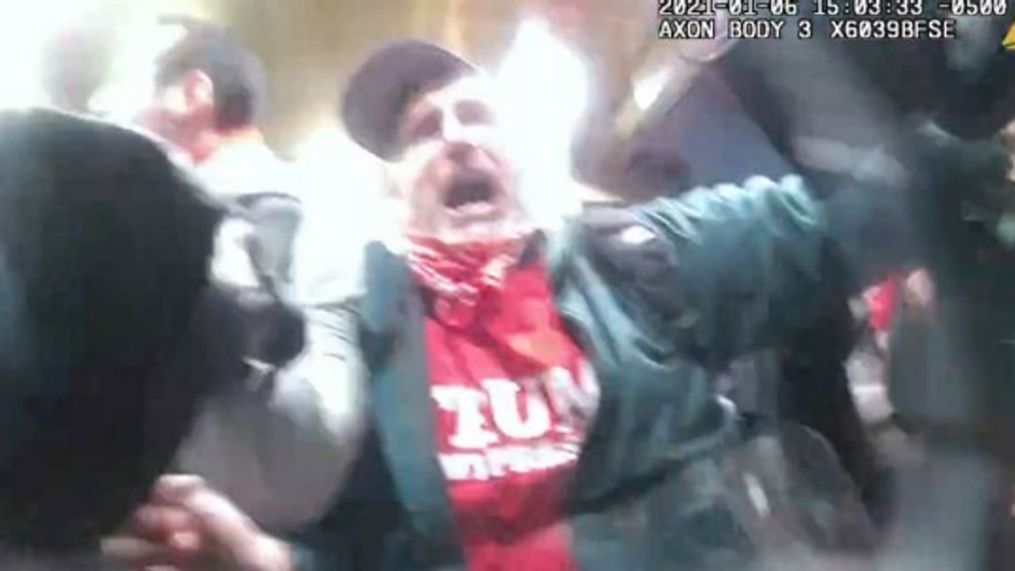 Outside Weeks cheered on rioters who were vandalizing the US Capitol building. He then approached a window, waved a black can of OC spray through one of the broken panes of glass, then broke the window with a wooden stick.