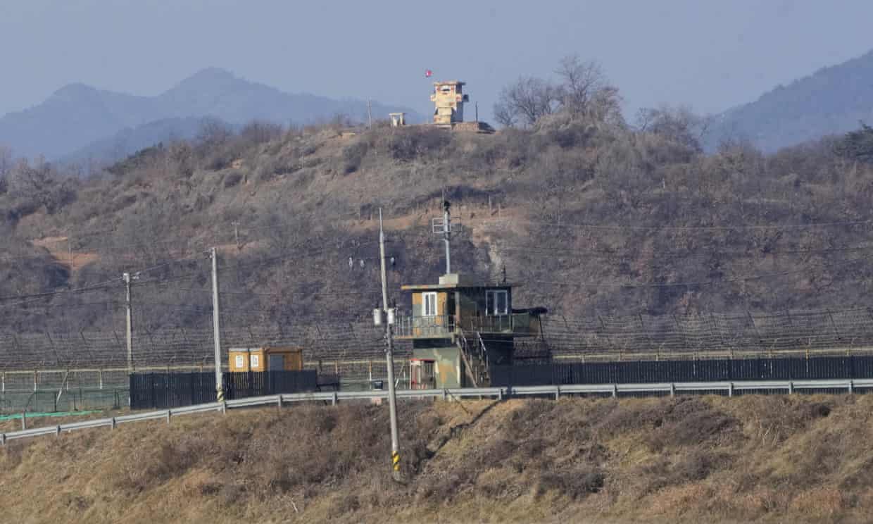 Military sentry posts of North Korea, rear, and South Korea, front, are seen in Paju, near the border with North Korea. Photograph: Ahn Young-joon/AP