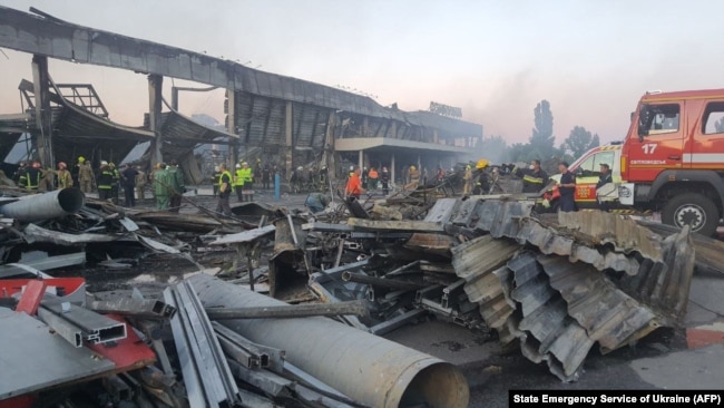 Rescuers working sift through rubble at the Amstor shopping center in Kremenchuk after it was hit by a Russian missile strike on 27 Jun 2022. Photo: State Emergency Service of Ukraine / AFP