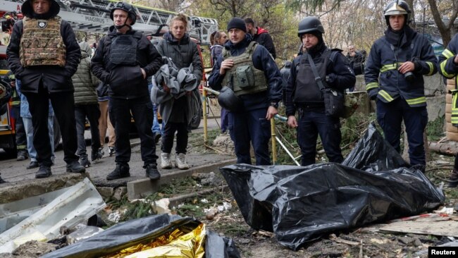 Police officers stand next to the bodies of people found under the debris of an apartment building that was hit by a Russian air strike in Kharkiv on 31 Oct. Three were killed and scores wounded. Two boys, aged 11 and 15, were among the dead. Putin has turned Ukraine into a killing zone (UKZ), like Netanyahu’s AKZ in the Middle East. (Photo: Reuters)