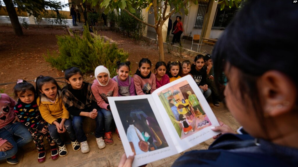 Displaced children, who fled Baalbek city and the nearby towns of Douris and Ain Bourday with their families amid the Israeli onslaught, listen to a story at a school being used as a shelter in Deir Al-Ahmar, east Lebanon, 31 Oct 2024.