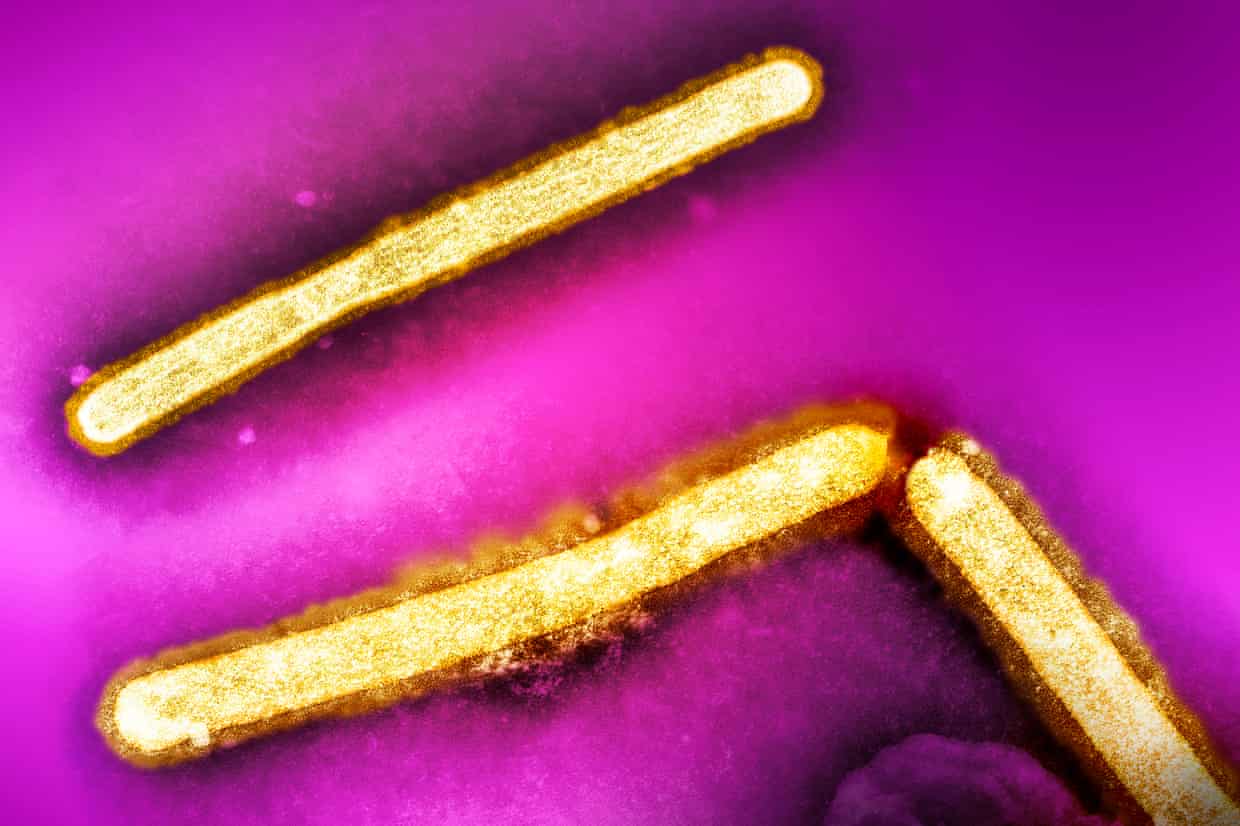 A colorized transmission electron micrograph of three H5N1 virus particles. Photo: CDC & NIAID via Flickr