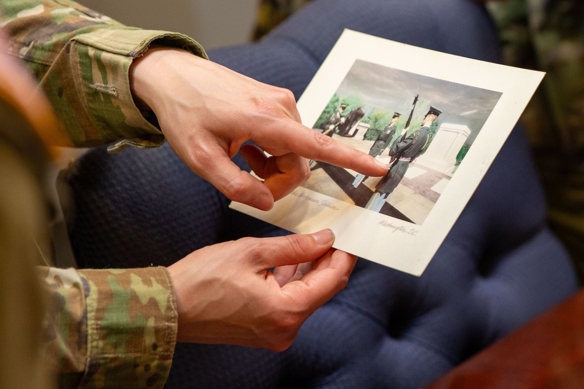 MG Zana points to a photo from his assignment as a Tomb Sentinel (Jun 1989 to Sep 1991). (US Army photo by SGT Ethan Scofield).