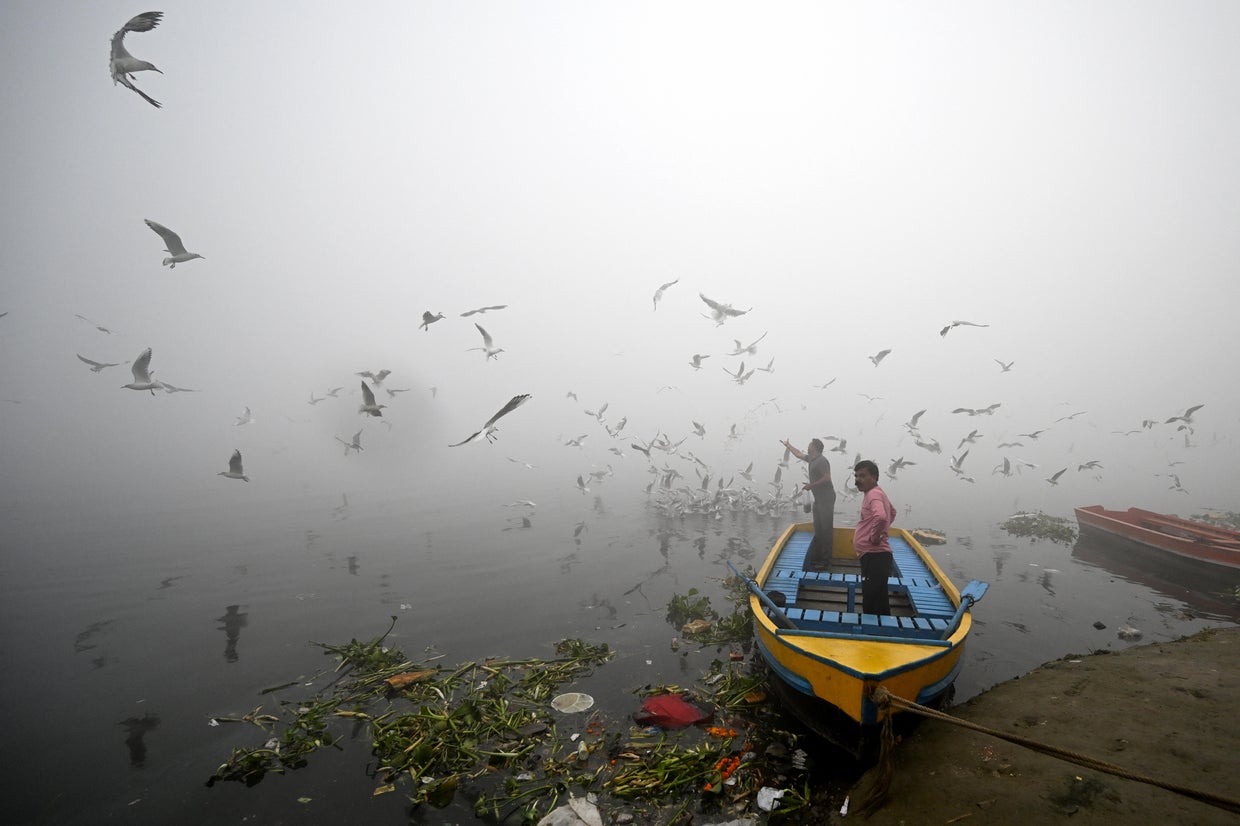A man feeds seagulls on the Yamuna River, engulfed in smog amid severe air pollution in New Delhi, India, 14 Nov 2024. Photo: Arun Sankar/AFP/Getty