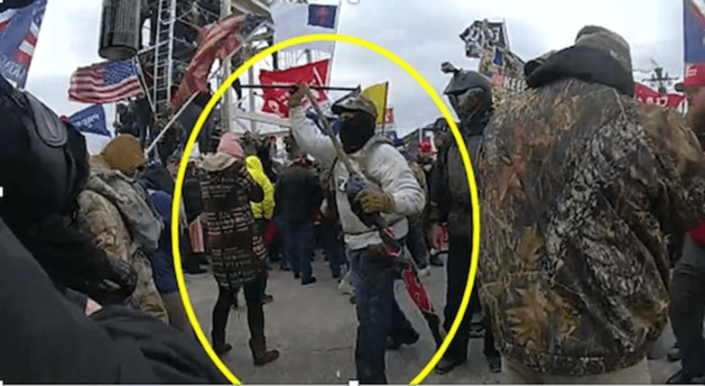 Terry Allen holding a metal bar that he threw at a police officer during the 6 Jan 2021 Capitol attack. Allen’s attorney claims the throwing of the pole was a reflex action after being pepper sprayed. (Photo: Government documents)