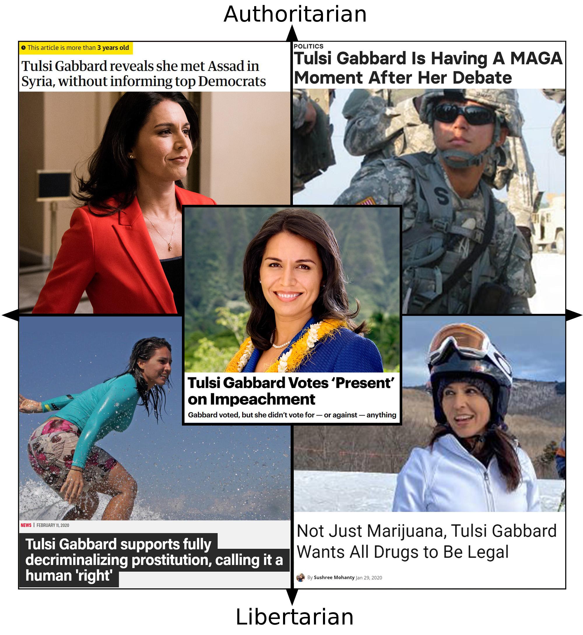 In early 2017, while still a member of Congress, Gabbard met with Assad, saying that peace in Syria was only possible if the international community would have a conversation with him. “Let the Syrian people themselves determine their future, not the United States, not some foreign country,” Gabbard said, after chatting with a man who had stopped the Syrian people from determining their own future by reportedly using chemical weapons on them. Two years later, she added that Assad was “not the enemy of the US, because Syria does not pose a direct threat to the US,” and that her critics were merely “warmongers.”