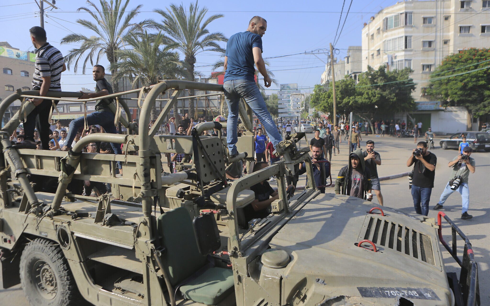 Palestinians ride on an IDF vehicle taken from an IDF base overrun by muqawama fighters near the Gaza Strip border, 7 Oct 2023. (Photo: Abed Abu Reash / AP)