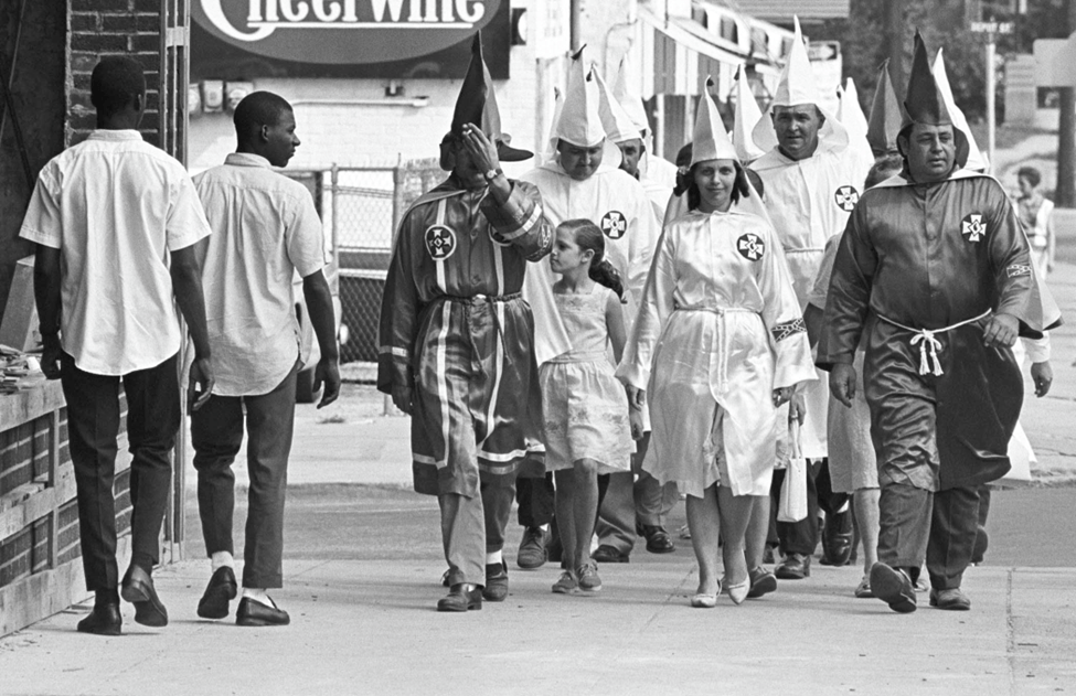 In 1968 members of the KKK, a domestic terrorist organization, proudly walked the streets in “Old Dixie”. You wonder what that little girl (C) is thinking and what has happened to her since. The two young men on the left may have served their country in Vietnam.
