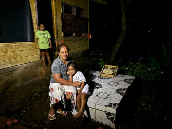 Siiae Olilefauaitu sits outside her house with her surviving children. She won’t move from her hovel because her dead unvaccinated daughter is buried on her property. (Nov 2024 Photo: Michelle Duff / The Guardian)