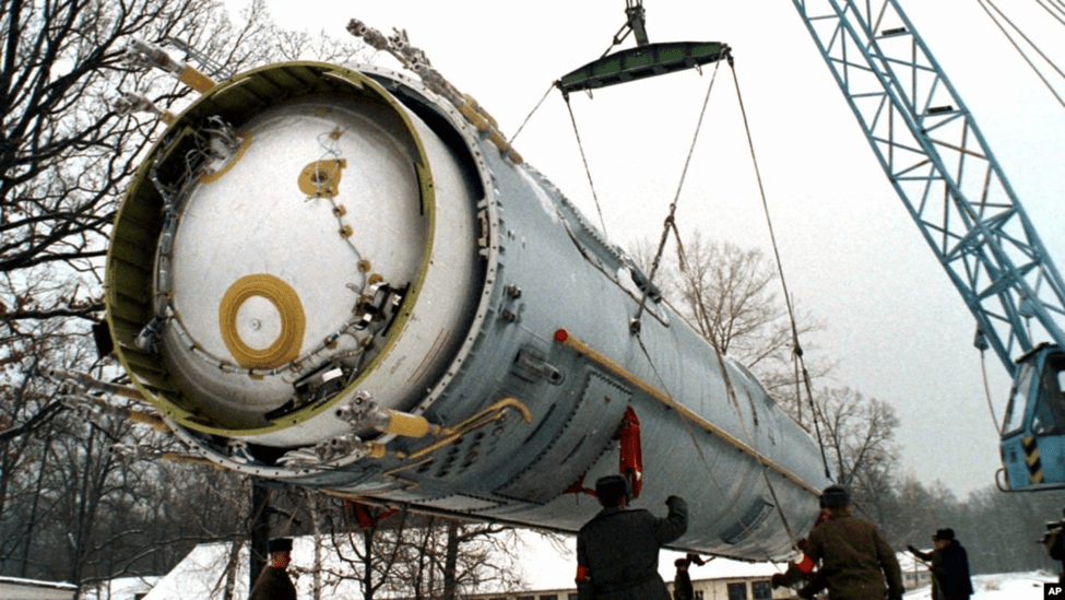Soldiers prepare to destroy a ballistic missile at the former Soviet military rocket base in Vakulenchuk, Ukraine, 24 Dec 1997.