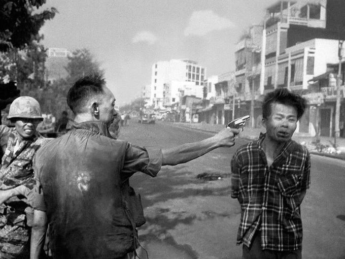 The ‘Saigon Execution’ is a 1968 photograph by Associated Press photojournalist Eddie Adams, taken during the Tet Offensive of the Vietnam War. South Vietnamese brigadier general Nguyễn Ngọc Loan shoots Viet Cong captain Nguyễn Văn Lém near the Ấn Quang Pagoda in Saigon. Antiwar Americans were sickened by the revolting Saigon regime and President Lyndon B. Johnson chose not to run for President again in 1968.