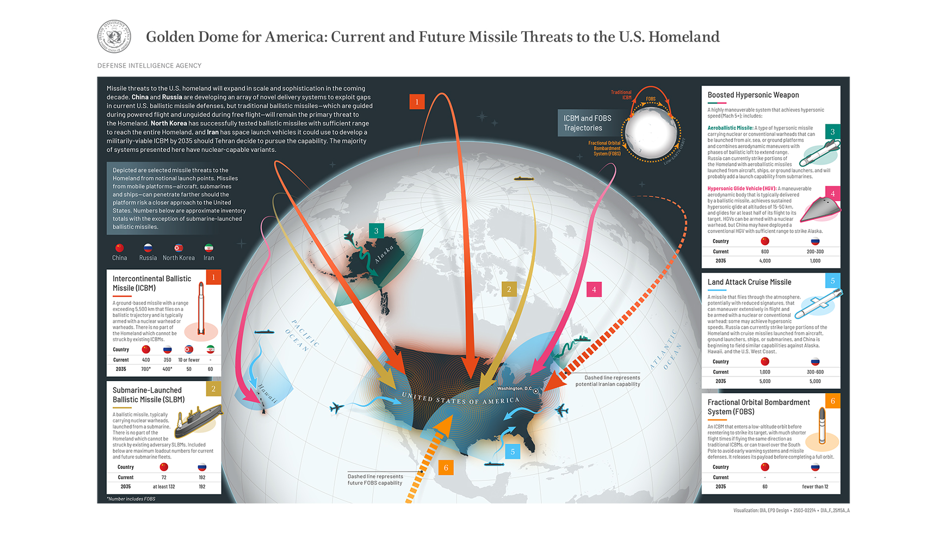 The worst person in the world will be enriching himself again at the detriment of the American taxpayer and the US national security establishment when Felon Musk’s SpaceX and Starlink companies receive the lion’s share of contracts for the multi-billion dollar Golden Dome missile defense system. This is Dotard Trumpf’s vison of President Ronald Reagan’s SDI or Star Wars defense project from the 1980s. To this end and sell the idea to the American citizen, the Defense Intelligence Agency (DIA) posted this infographic below promoting the need for the Golden Dome aerospace defense system.