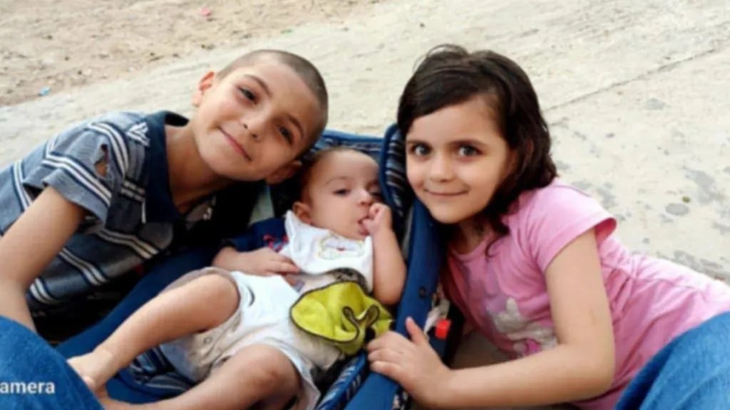 Adam (11) on the left is the only surviving child in the family. He is pictured here with his sisters Sidra and Rival (R) who were both killed in the Israeli air strike. (Photo: al-Najjar family)