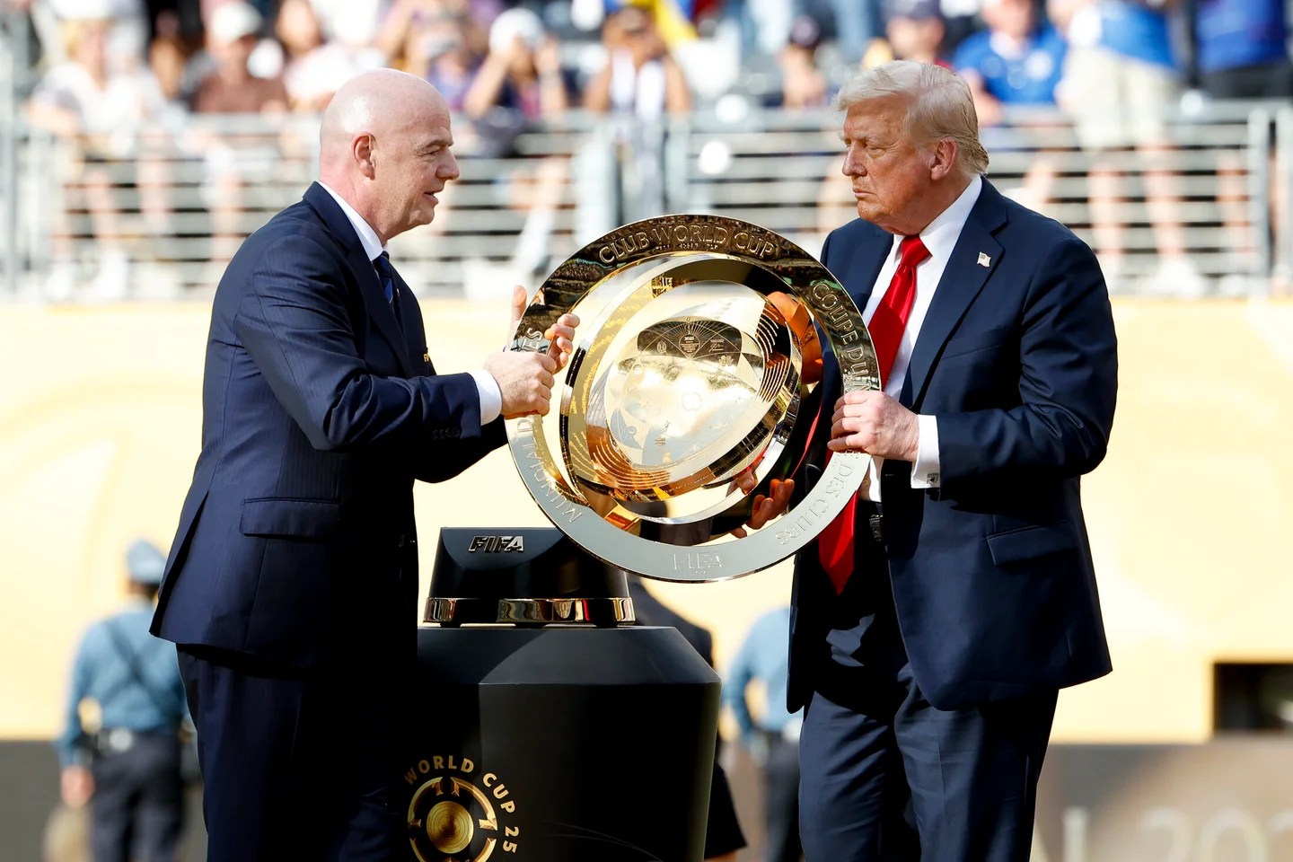 FIFA President Gianni Infantino and Dotard Trumpf carry the Club World Cup trophy after Sunday’s finals between Chelsea FC and Paris Saint-Germain. (Photo: Jean Catuffe via Getty Images)